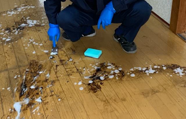 特殊清掃の場合はまず匂いの元を素早く取る必要があるので床に広がっている体液の清掃です。