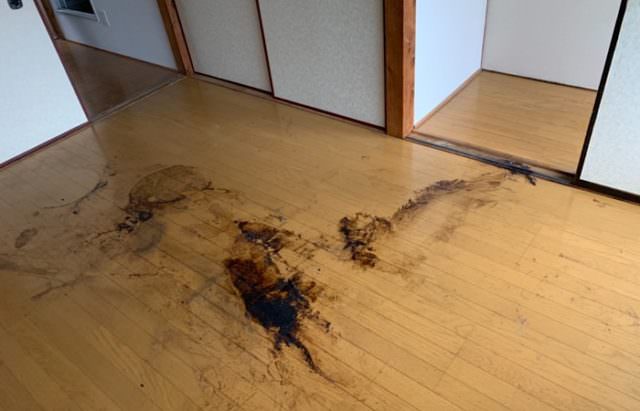 死後しばらく経っていたため体液が固まり床に付いている状態だったので