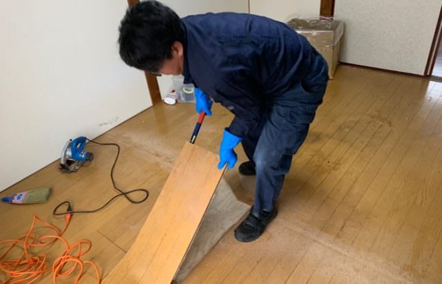 今回の物件は床下までは染み込んでいなかったので床をあげる作業のみです。